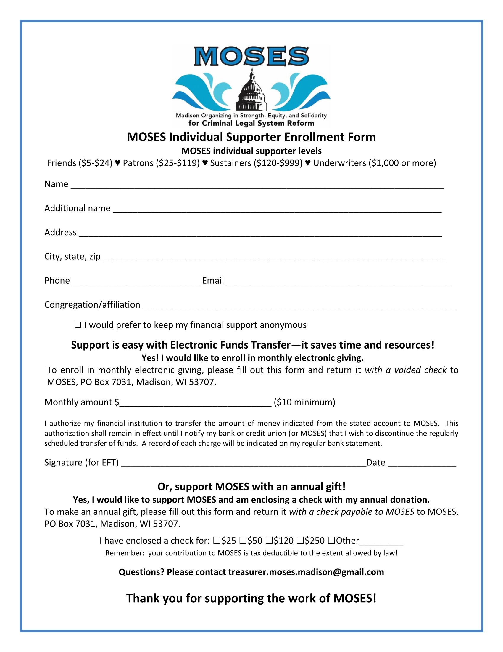 - Mail a check (payable to “MOSES”) to MOSES, PO Box 7031, Madison, WI 53707