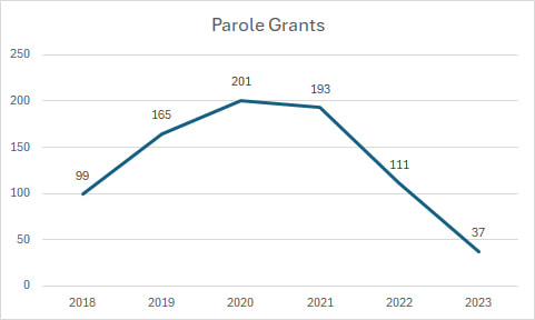 The figures on the Parole Commission website show a huge recent drop in the number of paroles being granted. Between 2019 and 2022, an average of 167 individuals a year were released on parole. In 2023 the number plummeted to 37 (or 40, if we count those whose cases were heard in 2023 and added on the website in January and February 2024). The number so far in 2024 (as of April 20) is just one.